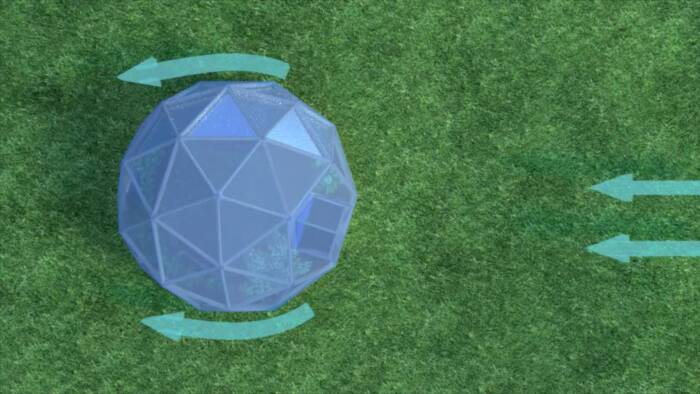 The Growing Dome’s frame is made of interconnected triangles. This geometry spreads wind loads across the entire structure and down into the foundation. Instead of stress concentrating at corners or rooflines, force is shared across dozens of struts. Triangular geometry converts lateral wind forces into compressive loads that move safely through the structure and into the ground due to the rigid nature of the triangular shape.